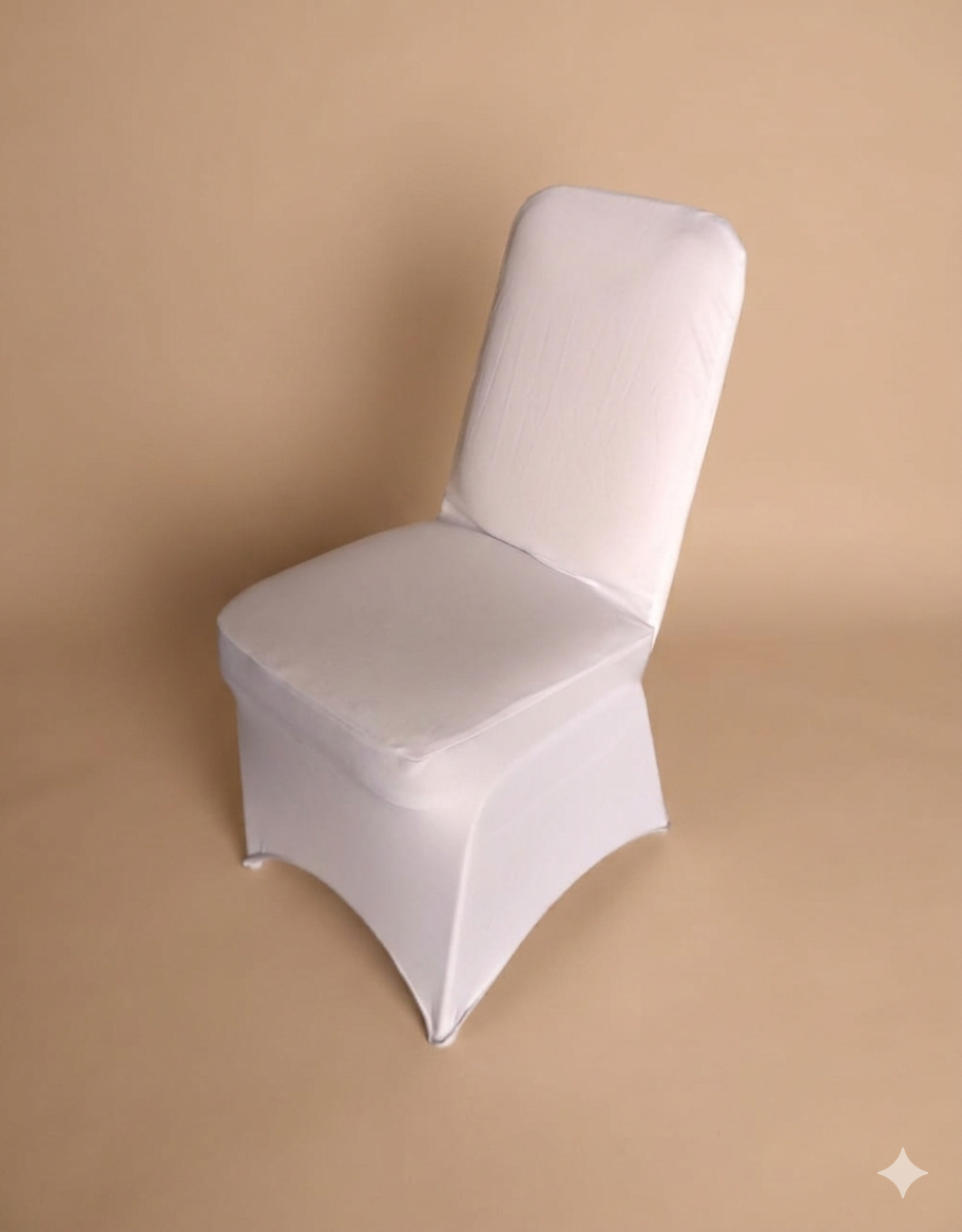 Kursi Bangket cover strait warna putih, membuat kesan mewah, cocok untuk acara pernikahan, acara ulang tahun, pertemuan, dll.