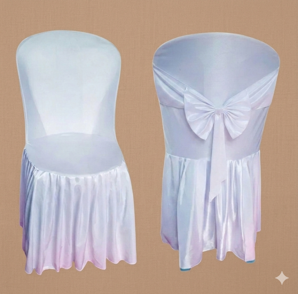 Kursi Plastik + sarung warna putih, membuat tampilan menjadi lebih bagus untuk acara pernikahan, acara ulang tahun, pertemuan dll.